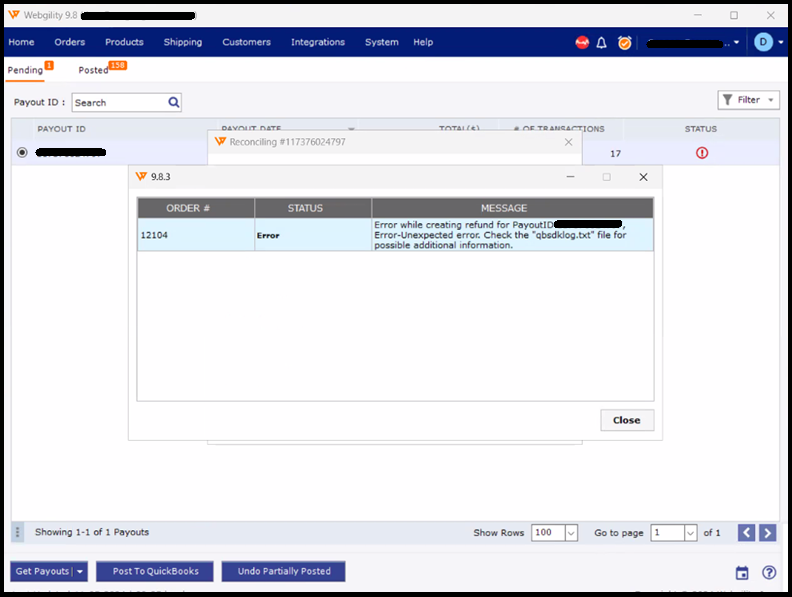 When attempting to create a refund for a PayoutID in Webgility Desktop, you may encounter the error message: "Unexpected Error. Check the 'qbsdklog.txt' file for possible additional information."