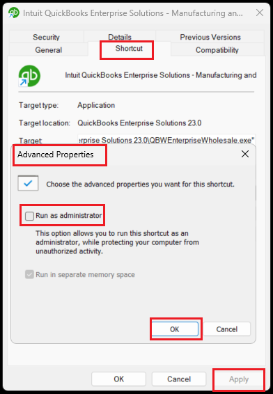 Enable "Run as Administrator": Check the box labeled "Run as Administrator" to give the required permissions to run QuickBooks Desktop properly.