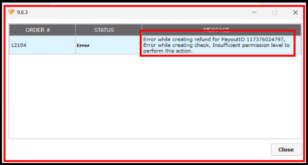Error while creating refund for PayoutID, Error while creating check, Insufficient permission level to perform this action