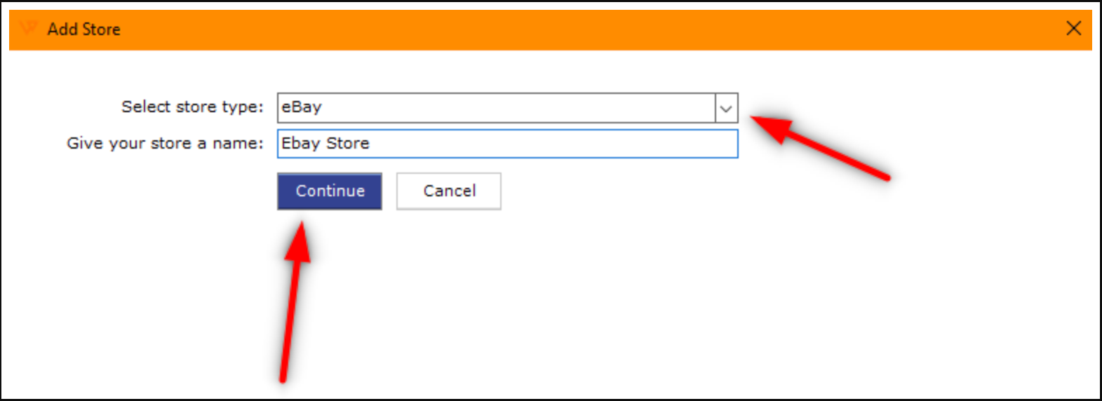 3. Make sure eBay is the selected store type and the connection has a name. Click Continue.