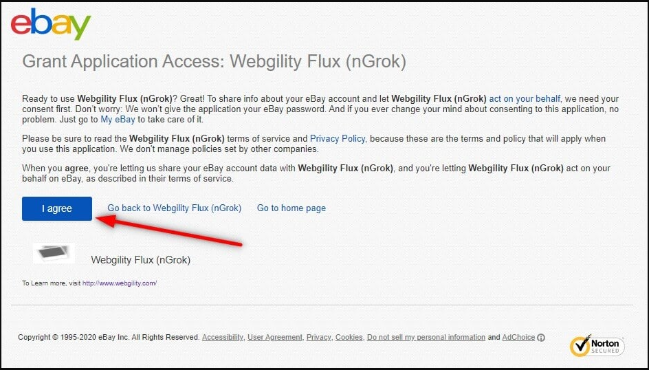 6. After entering the credentials click Sign in. You will see a popup to allow Webgility Desktop to access the eBay account. Then click I agree.