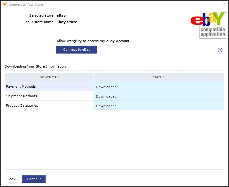 7. Once you click I agree, you will see a message from Webgility Desktop that it successfully connected with eBay and you can close the browser window. Return to Webgility Desktop and click Continue.