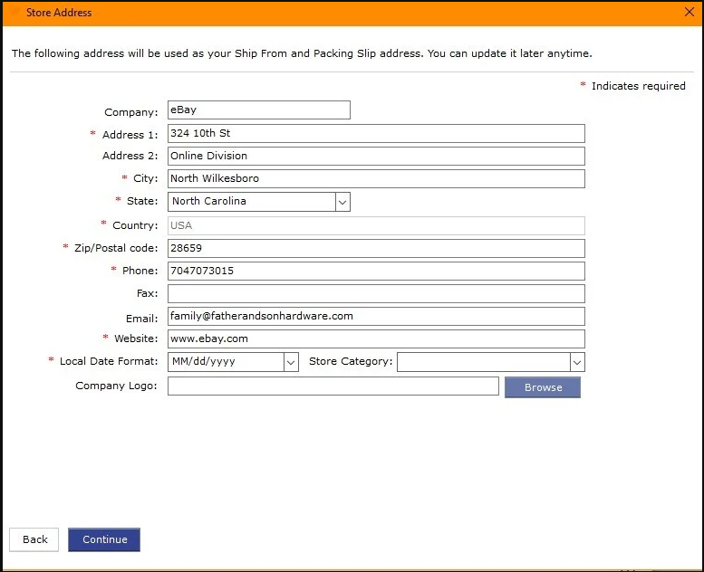 8. Next, fill in your company's information and click Continue. If you are simply updating a connection, click Save Store.