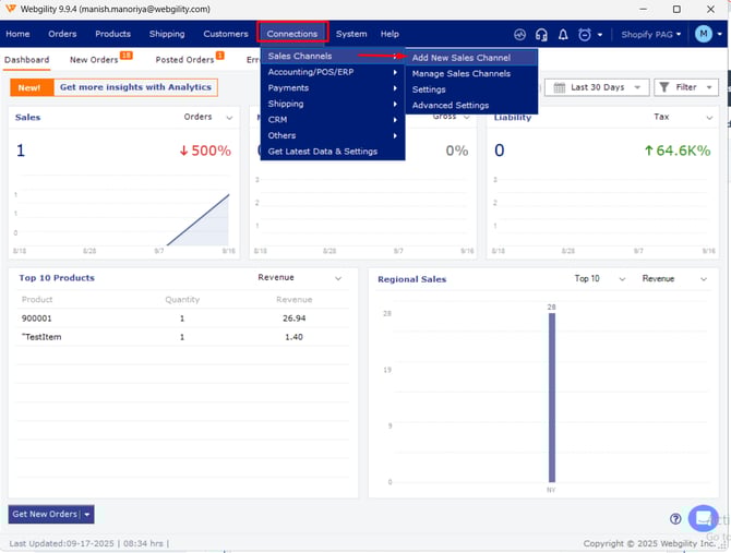 1. Once you have logged into Webgility Desktop go to Connections > Sales Channel > Manage Sales Channel. If adding a new connection select Add New Store.