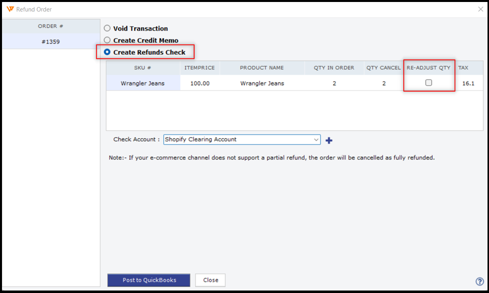 Note: Refund transactions created by Webgility will by default return all items you are posting to inventory. If you do not want to return an item to inventory, click the Re-Adjust Quantity checkbox.