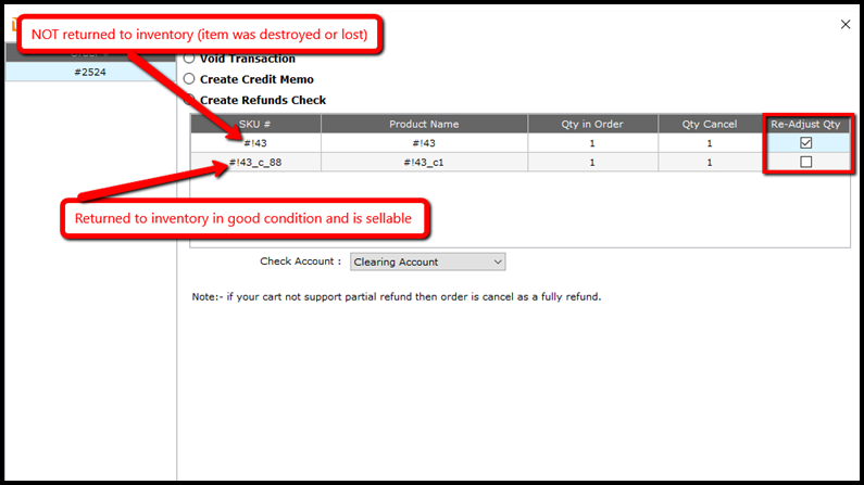 In the below example, SKU #!43 is not being returned to inventory because it was either damaged or lost or cannot be restocked for some other reason. The second SKU is being returned to inventory and can be sold to another customer.