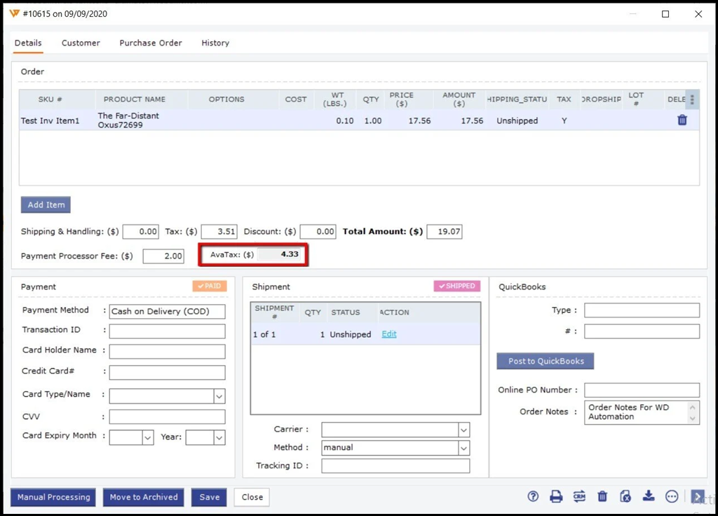 2. Once the order has been successfully posted to QuickBooks Desktop, Avalara AvaTax will calculate the correct taxation by verifying the address on the order.
