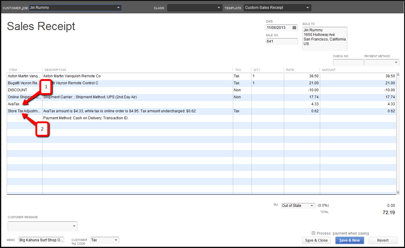 Store Tax Adjustments: If the taxation rate in your online store is calculating taxes at a rate that doesn't match what Avalara AvaTax calculates, this will create a discrepancy either over or under the tax calculation. The discrepancy and amount will be recorded as a Store Tax Adjustment item and the amount and reason will show within the description area of the transaction. The discrepancy will adjust the total of the transaction in QuickBooks Desktop. If you see discrepancies caused by an incorrect calculation of tax in your online store, you should modify the tax percentage in the online store.