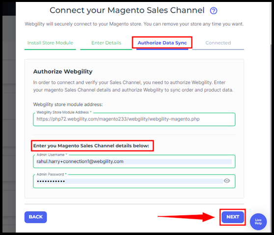 7. You’ll be redirected to the Authorize Data Sync tab, here enter the Admin/Primary Username and Password of the Magento sales channel and proceed with the Next option.