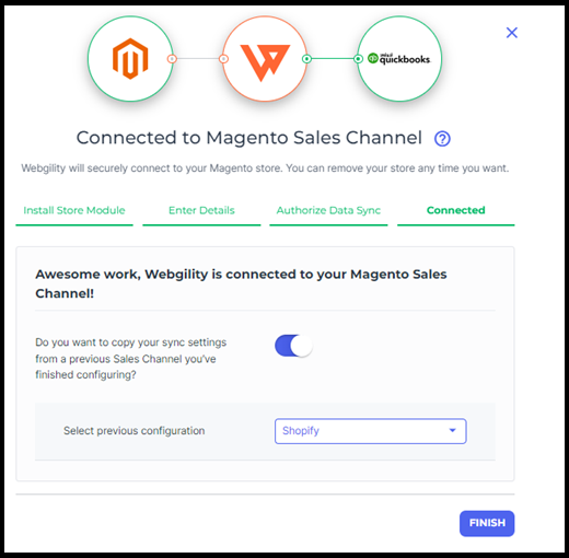 8. Another pop-up will appear, giving you the option to copy your sync settings from other connected sales channels within Webgility Online. If you want to duplicate the existing settings, toggle the button to enable it, then choose the sale channels from the drop-down menu. Otherwise, just select the "Finish" option.