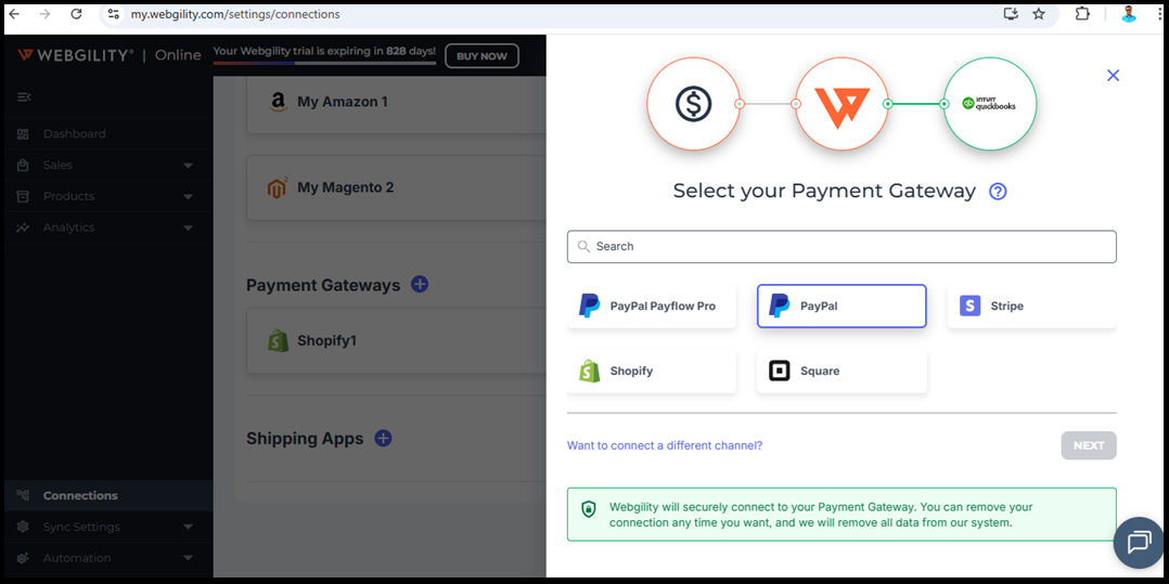 Review the steps below to integrate payment gateways with Webgility Online. For this guide, we’ll use PayPal as an example to illustrate the integration process within Webgility Online.