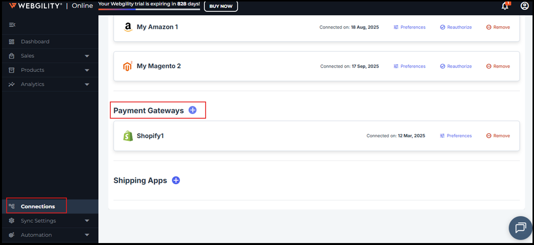 1). To connect PayPal as a payment gateway, on the left hand-side navigation panel go to Connections and click the blue plus sign next to Payment.