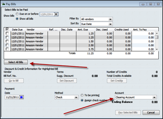 2. Then click on "Select All Bills" and make sure the Account is set to Clearing Account.