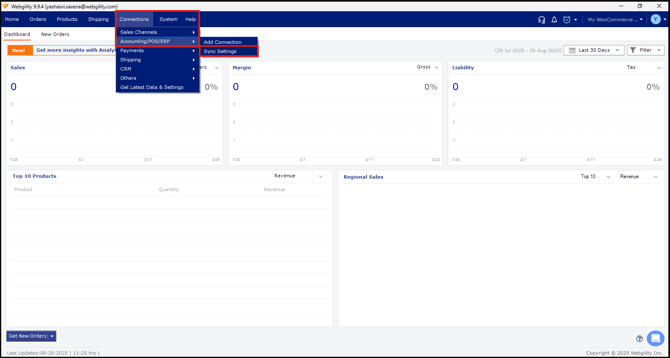 1. In Webgility Desktop, navigate to Connections > Accounting/POS/ERP > Sync Settings.