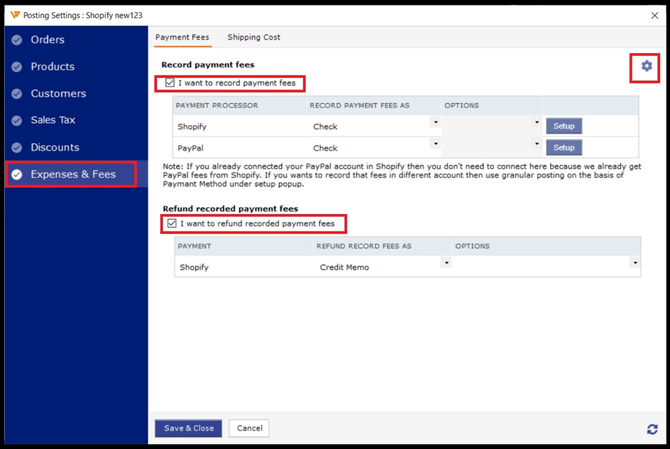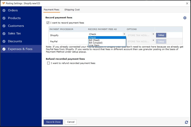 2. Go to Expenses & Fees section. Then under Payment fees > Record Payment fees enable both "I want to record payment fees" and "I want to refund recorded payment fees"