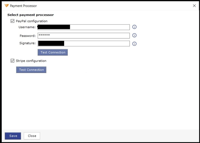 4. Enable your required payment processor and update the require credentials and Test Connection. Once done then click on Save. Then Save and Close.