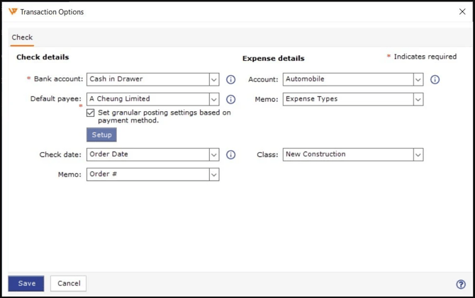 6. If you select Check, you will need to provide your bank account and default payee, along with some optional details.