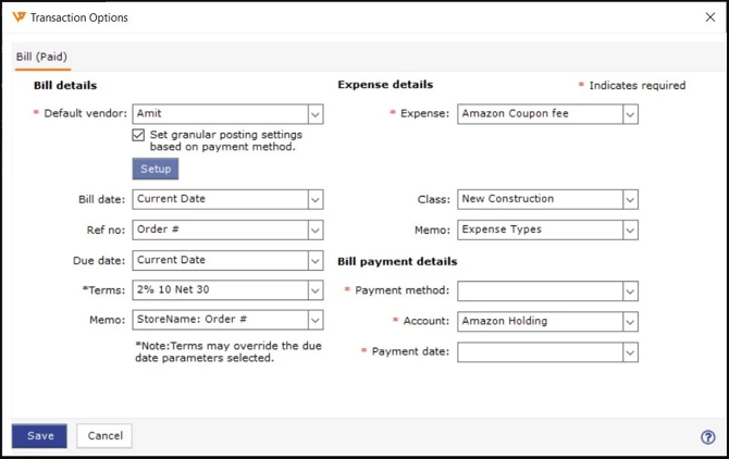 8. If you select Bill, you will need to provide a default vendor and expense, along with some optional details.