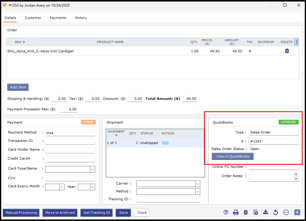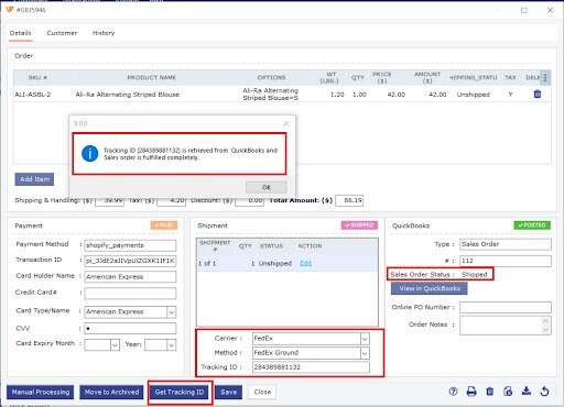 Use the Posted Order tab or the Order Details screen to retrieve the shipping and tracking details from QuickBooks. This process can also be automated by using the Webgility Scheduler. Webgility will retrieve the sales order status along with the shipping details. The sales order status will have various stages like Sent for Pick, Sent for Pack, Partially Shipped, and more. Webgility will retrieve the order until the sales order status is Closed or Shipped.