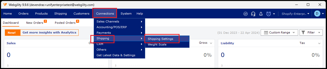 You can retrieve the sales order and shipment information from QuickBooks. Navigate to "Connections" then goto "Shipping" and click on "Shipping Settings".