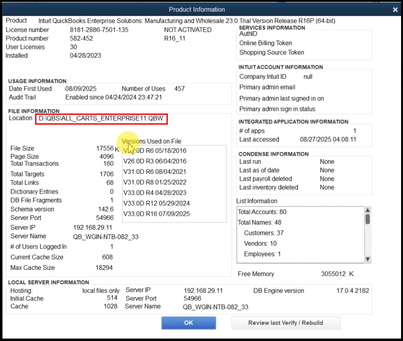 7). Copy the company file location from the Product Information window, then close it.