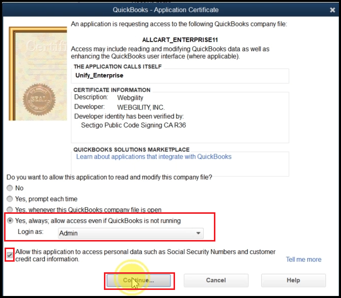 9). This will open the Application Certificate in QuickBooks and grant access to the Webgility Desktop application from QuickBooks as an admin.