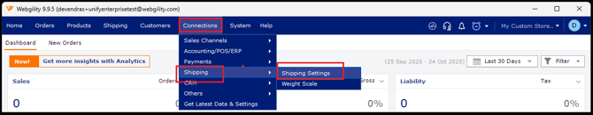 1. To integrate Stamps, in Webgility Desktop navigate to Connection > Shipping > Shipping Settings.