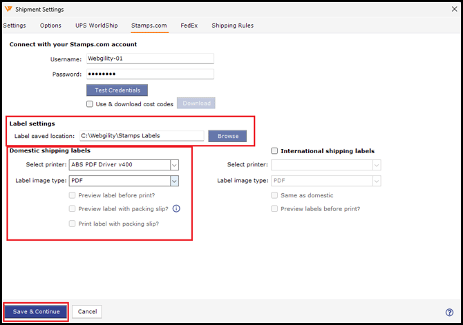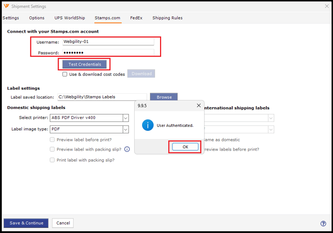 3. Enter your Stamps.com username and password, then click Test Credentials.