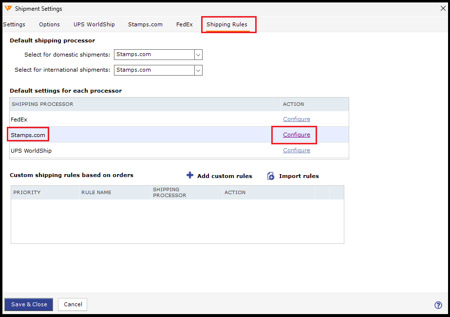 9. In order to set some default rules for this shipping processor, go to the Shipping Rules tab. Click Configure for that particular shipping processor.