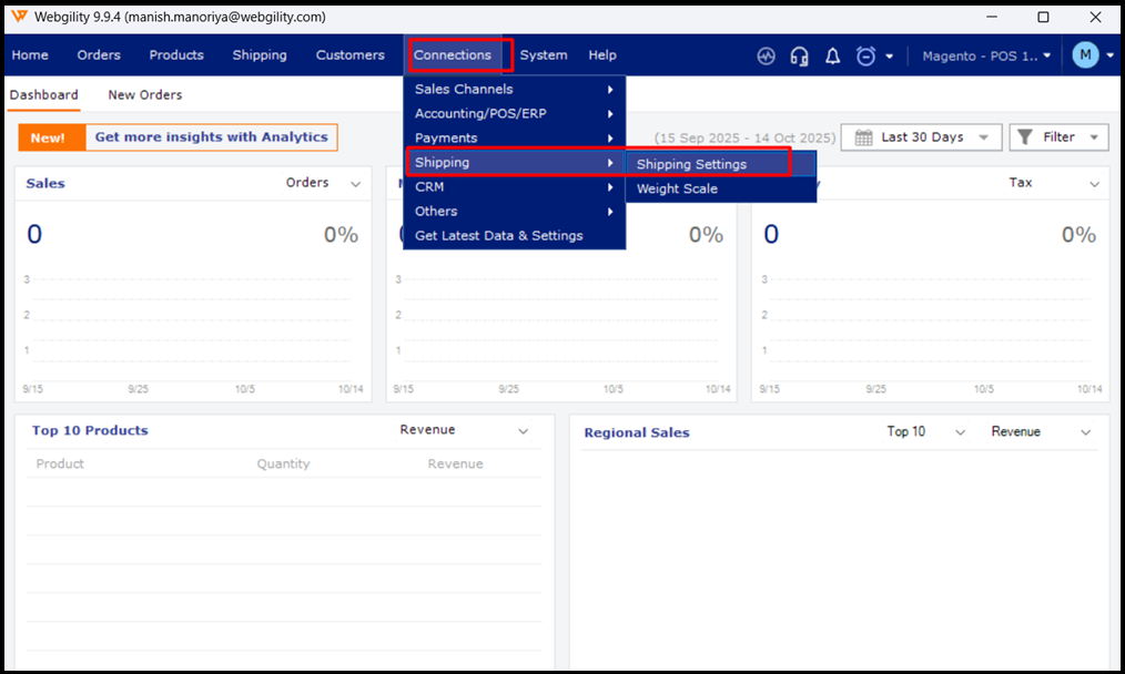 2. Navigate to Connections > Shipping > Shipping Settings.