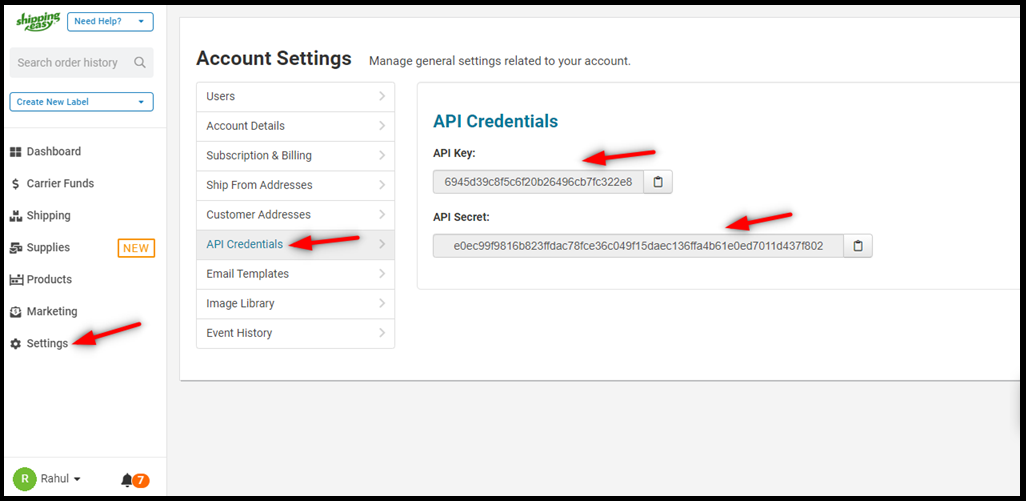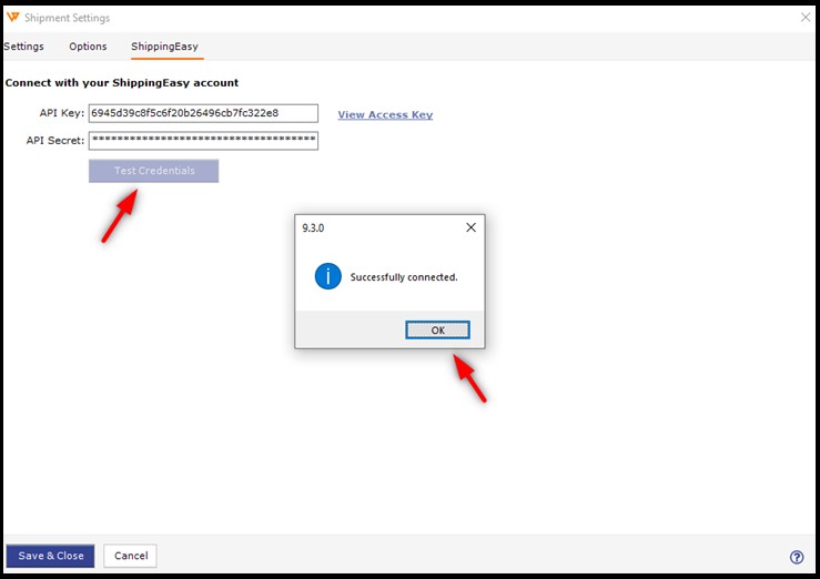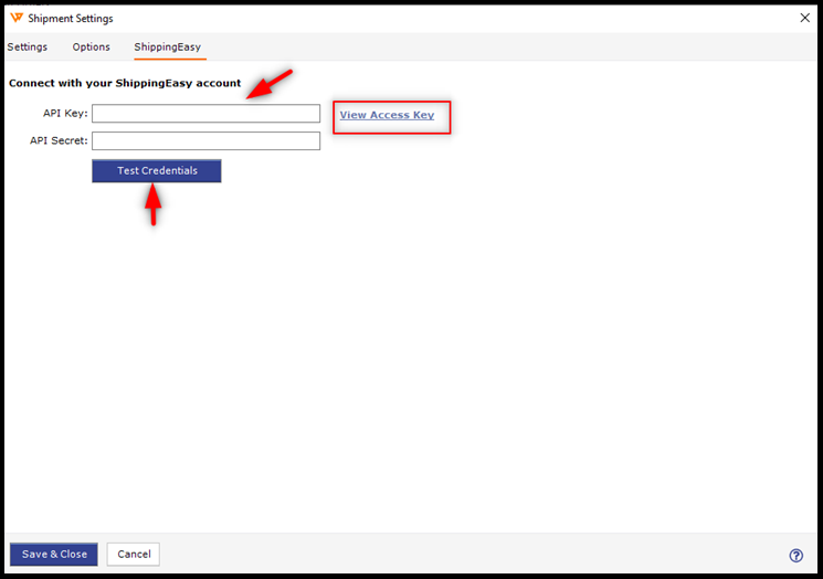 4. Enter the API key and API secret key for the connection. You can find these key's in the account section of your ShippingEasy Admin login. Click Test Credentials.