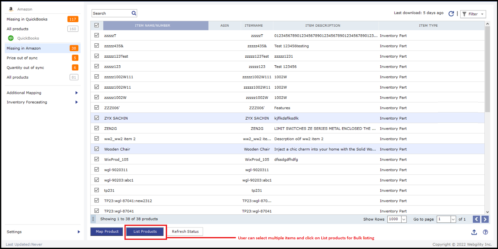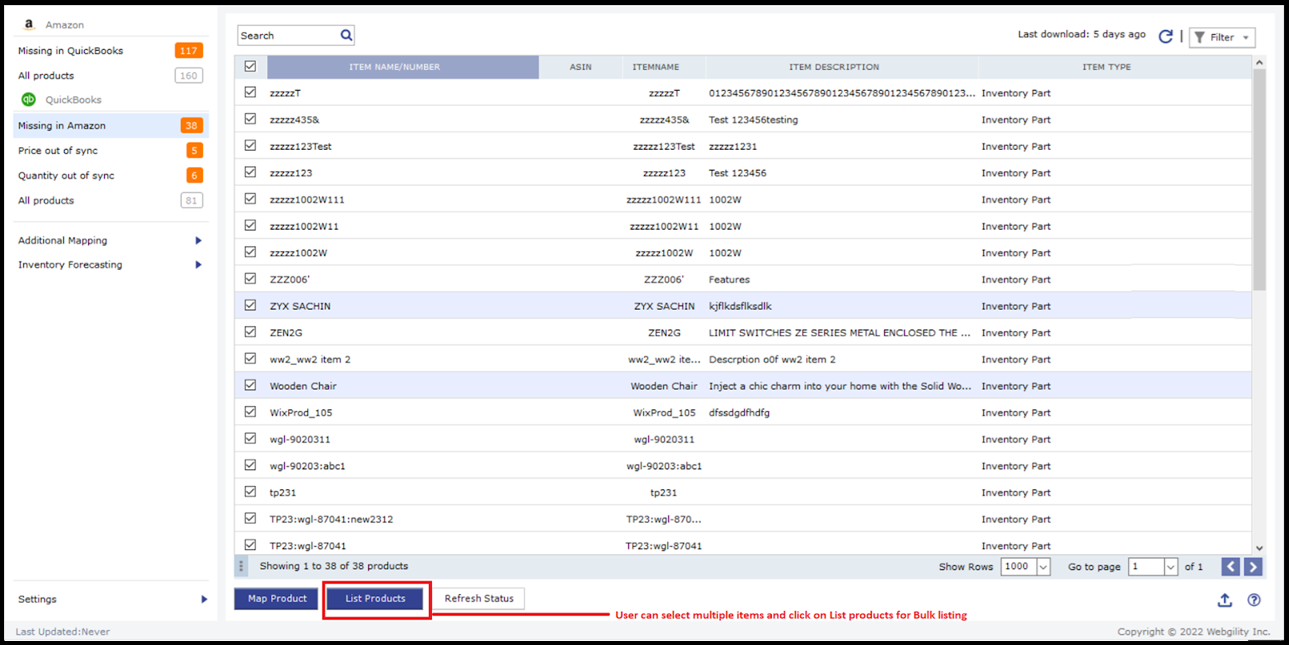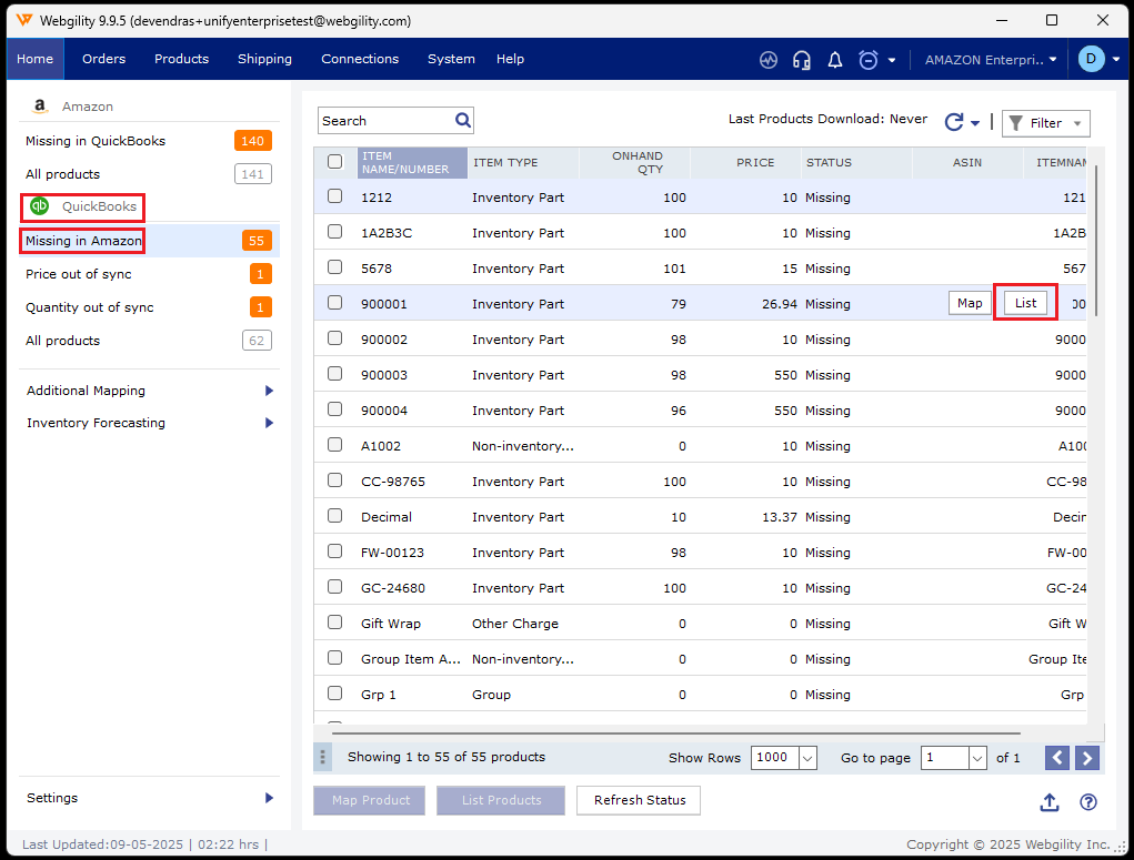 1: In Webgility Desktop, navigate to Products, and navigate to Missing in Amazon on the left side of the page. Here, you'll find items that are available in your accounting system, but missing in Amazon. You'll see two available options as you select products: Map & List.