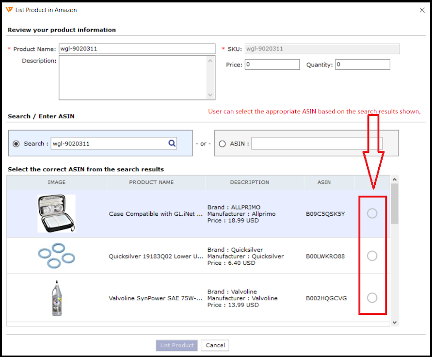 Enter keywords associated with the product. Once you click the magnifying glass, Webgility Desktop will search for the ASIN on Amazon and display a list of potential ASINs.