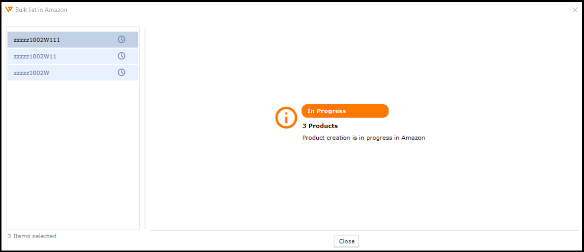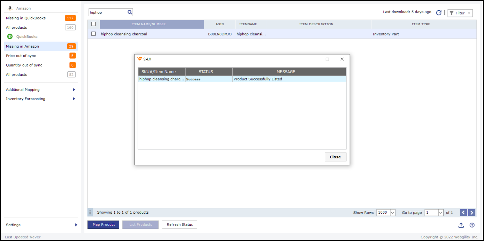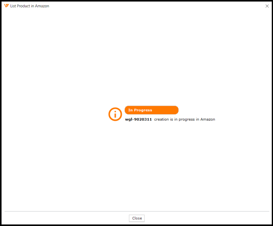 3. Once you click List Product, Webgility Desktop will send a request to Amazon's end to confirm the listing. Note: this process can take a while. The listing will continue to show as In Progress until Webgility Desktop has confirmation from Amazon.