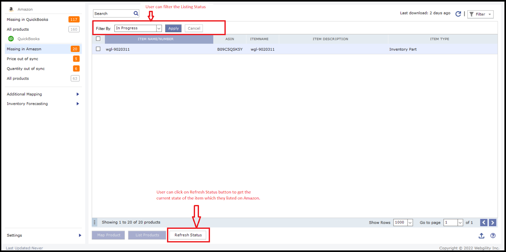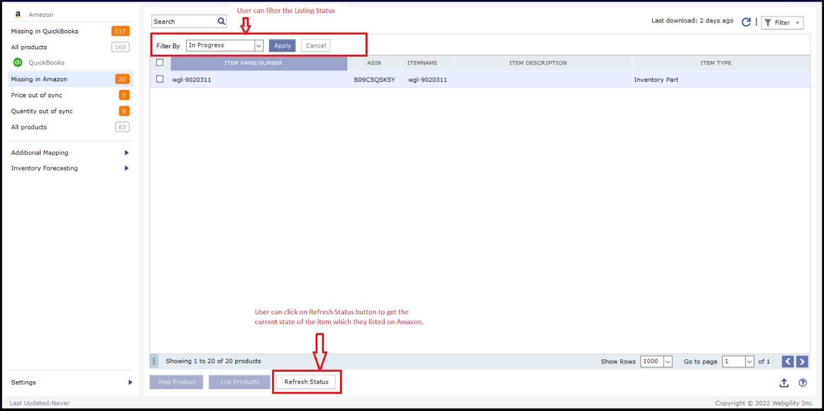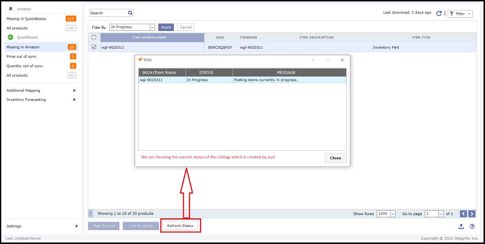 5. To check the status of your product listings, head back over to the Missing in Amazon tab. Filter by "In Progress" select the checkboxes and click Refresh Status.