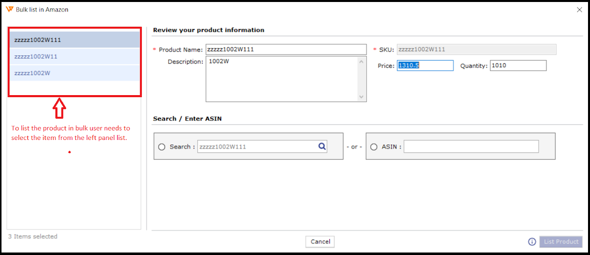 2. The following pop-up will appear. The products you've selected will appear in a list on the left side of the window. In order to list your product, you will need your ASIN. You can search for the ASIN on the left side, or enter the ASIN on the right side.