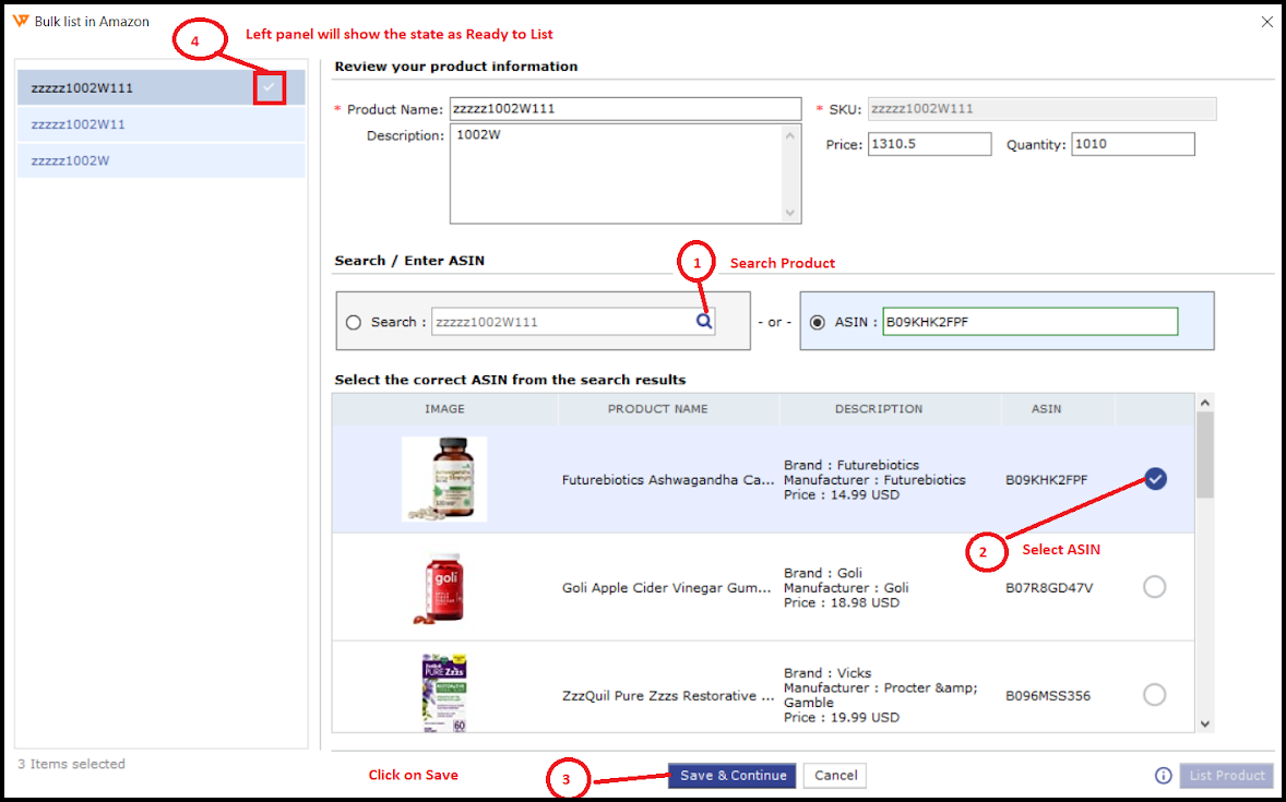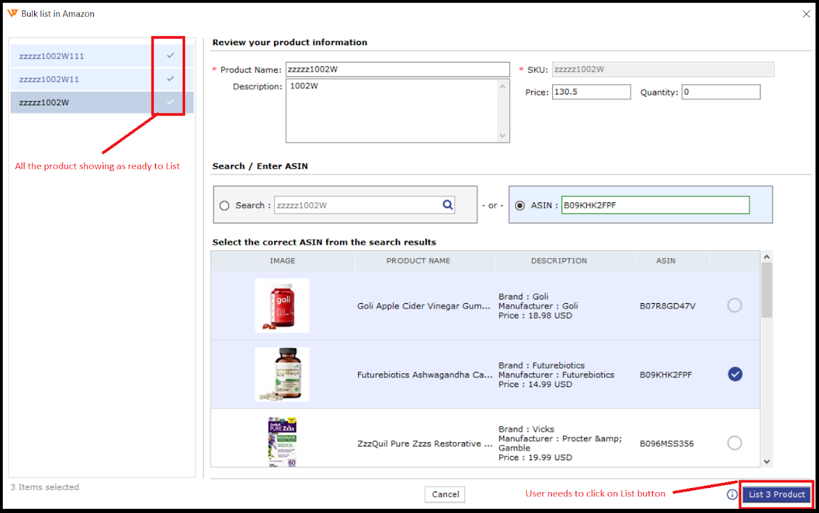 3. Repeat the process to work your way through your bulk list on the left side of the page. As you go, checkmarks will continue to appear. Once all of your products have a checkmark next to them, you can click the List button.