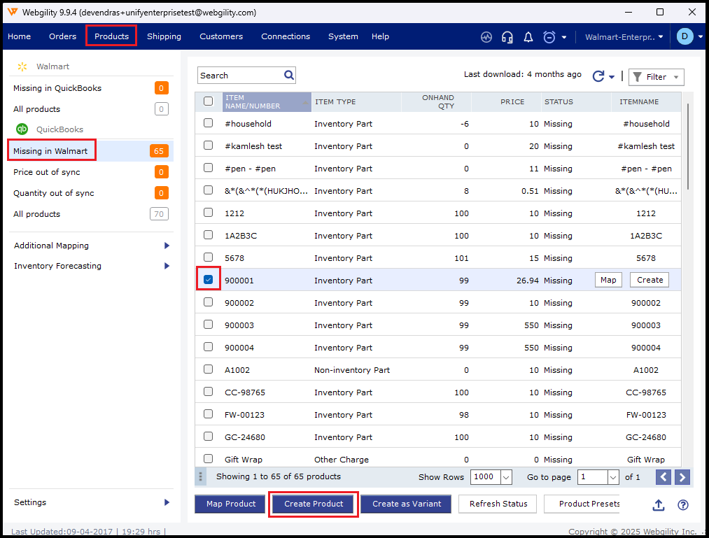1: In Webgility Desktop navigate to Products in the Menu options. Go to the Missing in Walmart tab on the left will show you all of the products which are available in your accounting system, but are missing in Walmart. As noted on the bottom of the page, you'll see options for Map Product, Create Product, and Create as Variant.