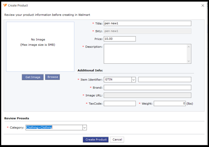 2. The pop-up below will appear. Information will be pre-populated based on presets. You can edit these options as you see fit. You can also add an image of the product.