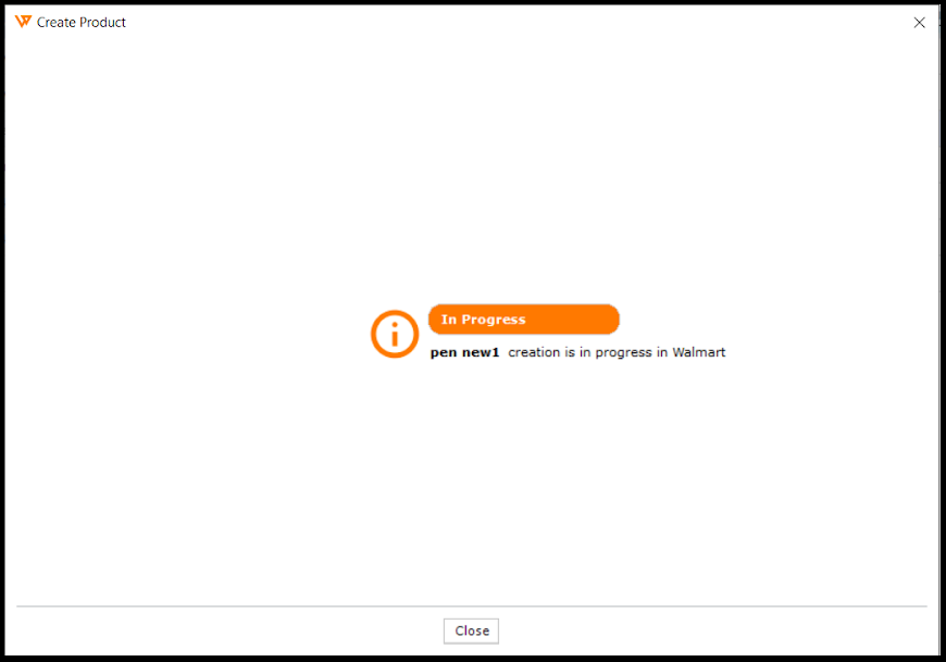 4 : After you click Create Product, Webgility will send the request to Walmart. You'll see an In Progress notification. Hang tight! This process can take a few minutes to complete.