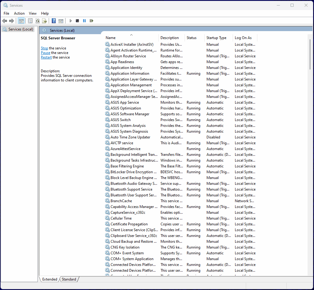 7). Type 'Services' in the Windows search bar and open it. Find 'SQL Server [Instance name for Webgility Desktop]', right-click on it, and select 'Restart'. Then, do the same for 'SQL Server Browser'.