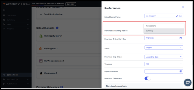 If you are unable to decide which accounting method to select, refer to the help article. Summary Posting vs Transactional Posting in Webgility Online