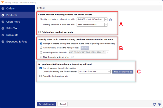 The Sync Settings screen lets you set how orders will be posted, including transaction details, products, customers, sales tax, discounts, and expenses/fees. You can customize each setting in detail to ensure all order information from the store is accurately recorded in NetSuite.