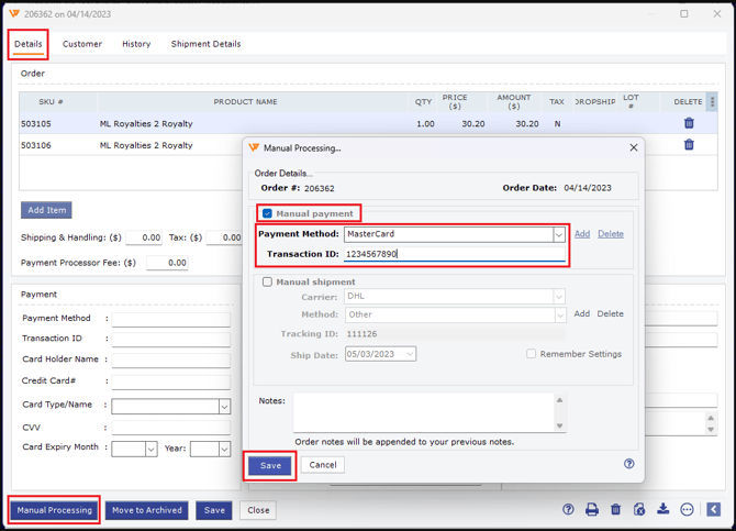 2). Once you are in the order details in the left-hand side bottom corner of the window, click on the option “Manual Processing,” then check the box for “Manual Payment,” select the correct “Payment Method,” and update the payment “Transaction ID” in its respective field then select “Save,” and this will mark the order as paid along with all the payment details that you have selected.