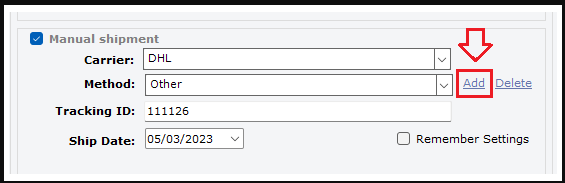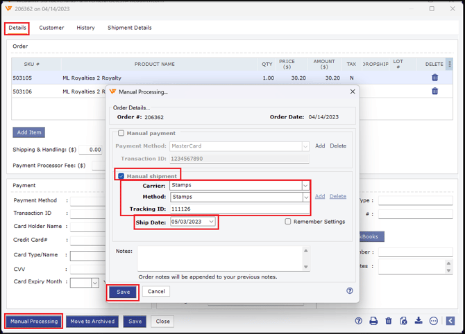 2). Once you are in the order details, in the left-hand side bottom corner of the window, click on the option “Manual Processing,” then check the box for “Manual Shipment,” then select the correct “Carrier.” Continue and select the correct "Shipping Method," update the shipping "Tracking ID" in its respective field, then "Save." This will mark the order as shipped along with all the shipping details that you have selected.