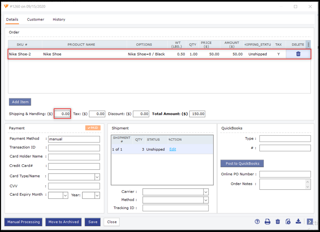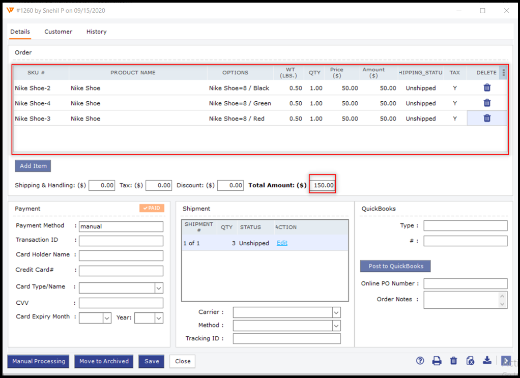 In the above screenshot, one or more items are missing or another amount is missing in the order, which is why the total isn’t matching. This causes the error.