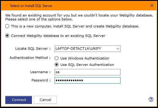 If you only have one Webgility Desktop computer, you will need to reinstall the Webgility Desktop Software and it will place the default version of Apiconfig file that will not have your database instance information in it so when logging back into Webgility Desktop it will ask you to connect to an existing SQL Server instance and then you will need to select the SQL Server instance which is hosting your Webgility Database. If this is the case then proceed further and use SQL Server Authentication (Username lower case: sa and Password case sensitive: Webgility2011 ) and try to connect. This should allow you to login back successfully.