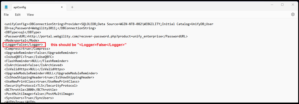 2). Incorrect Syntax: Another scenario is if a syntax on any of the existing nodes in the Apiconfig file is incorrect (means if a bracket is missing or there are extra characters) due to this Webgility Software is not able to read the Apiconfig file properly and will give you the same above-mentioned error. You will need to verify and correct all the syntaxes on all the nodes and properly save the file. Once done then restart the Webgility and it should allow you to log in again.