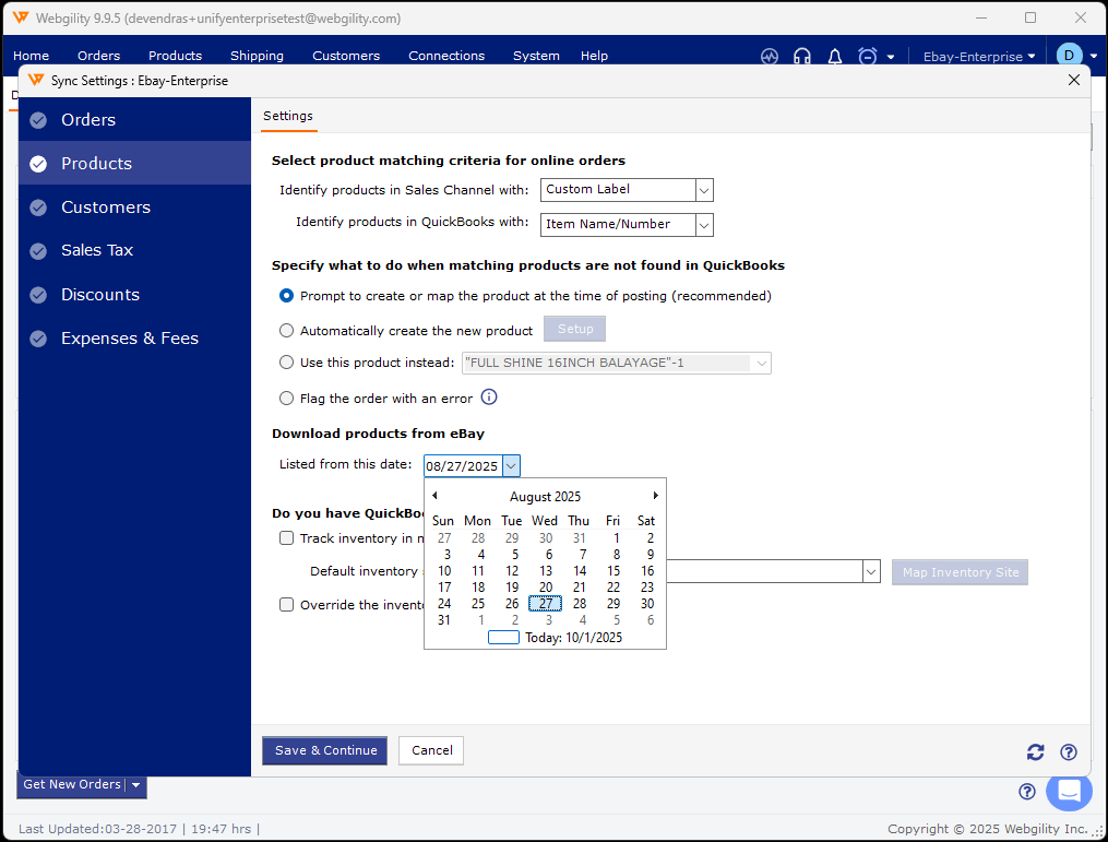 1). To download the items from eBay, you need to set the Item Listed Date under the Webgility setting. Navigate to Connections > Accounting POS/ERP> Sync settings > Product Settings and set the date for List from this date, set a back date, and click Save and Continue.