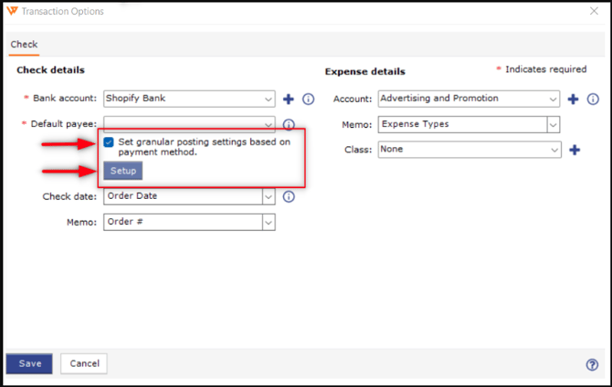 This will open a pop-up window for transaction options. Here, you need to check the box for Set granular posting settings based on payment method and click on Setup.